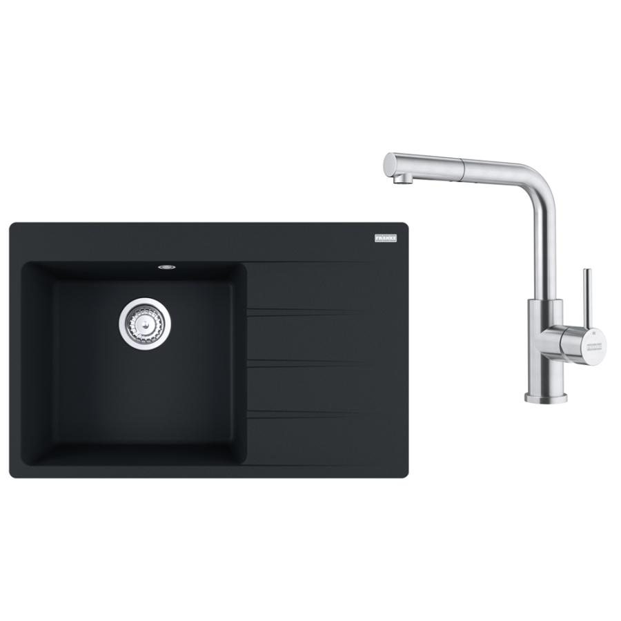 Drez CNG 611-78 TL/2 má moderné línie, jemne zaoblené hrany, k okraju miznúce drážky, tenký profil. Svieži a atraktívny dizajn. Drezy Centro odrážajú najnovšie trendy farebnosti v kuchyni a dokonale vyjadrí Váš individuálny štýl a vkus. Vyzerajú vynikajúco v akomkoľvek priestore. Materiál Fragranit je kombinácia 80% žuly a 20% akrylátovej polymérovej živice. Nestráca farbu, odolá krátkodobým teplotám až do 280°C (10 – 15 sekúnd), je odolný voči škvrnám, zachytávaniu nečistôt a poškriabaniu. Kuchynská batéria FC 6986 od spoločnosti Franke. Otočná 180°. S vyťahovacou koncovkou osadenou perlátorom.
